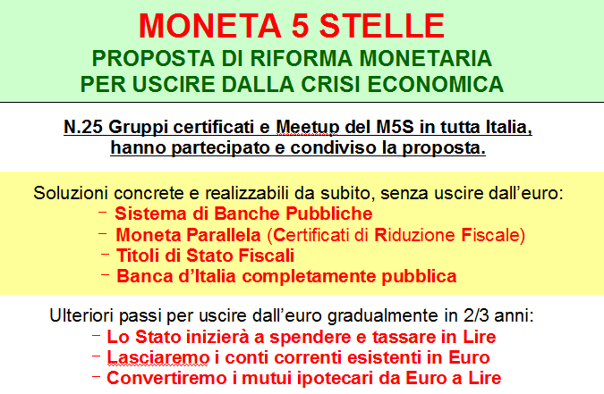 - una 1° parte più tecnica, nella quale Fabio Conditi, fondatore di Moneta 5 Stelle insieme al Consigliere Comunale Massimo Taddia e tutto il gruppo M5S di Zola Predosa (BO), ha cercato spiegare, con l'aiuto delle sue slides, come funziona il sistema economico e monetario, cosa significa rimanere o uscire dall'euro e quali sono le soluzioni concrete e realizzabili per uscire dalla crisi economica;